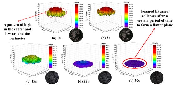 为此,论文基于计算机视觉技术设计了一套用于测试沥青发泡性能的双目测距系统。与传统测试方法相比,该系统能够实时测量泡沫沥青空间域内的三维形态并记录其变化过程。研究对比了不同的沥青发泡性能测试方法,验证了双目测距技术的测量精度和可重复性。此外,发现了泡沫沥青在演变前期形成中部隆起的形态,提出了考虑其全域膨胀特性的新指标;随后量化表征了泡沫沥青动态演变行为,根据DoseResp反应动力学方程反应了泡沫沥青动态演变规律,通过方程参数评估了泡沫沥青的膨胀特性和体积变化的时间依赖性。本研究探讨了双目测距技术在沥青发泡试验中的应用,并对整个过程进行了设计和验证,同时建立了一套可靠的评估系统,可用于全面测试沥青的发泡性能,从而在生产可持续冷再生沥青路面时更好地控制沥青发泡效果。