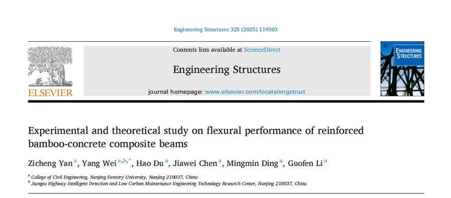 近日,21点游戏规则魏洋教授课题组在土木工程领域中科院一区Top期刊《Engineering Structures》发表了研究成果(Experimental and theoretical study on flexural performance of reinforced bamboo-concrete composite beams。硕士生颜子程为第一作者,魏洋教授为通讯作者,我校为第一完成单位。该成果得到了国家自然科学基金、江苏省自然科学基金和江苏省农业科技创新基金的资助。