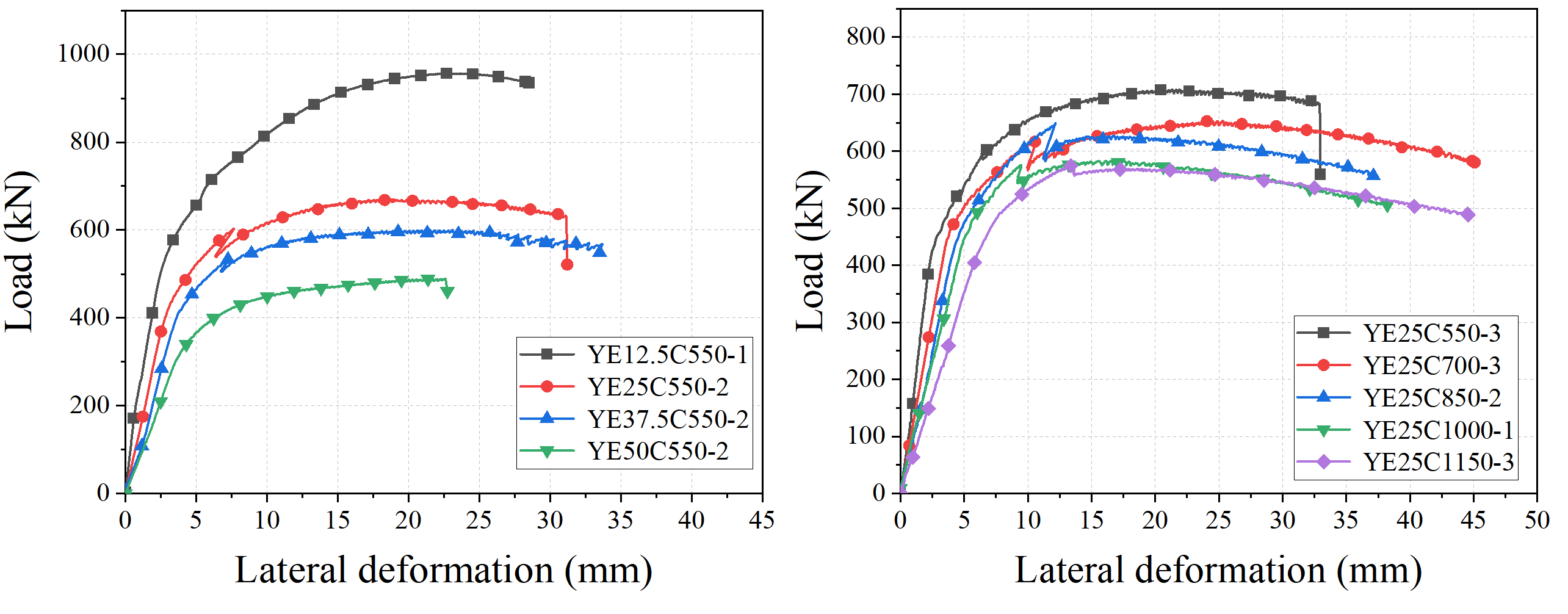 (a) 不同偏心距试件对比 (b) 不同长细比试件对比
