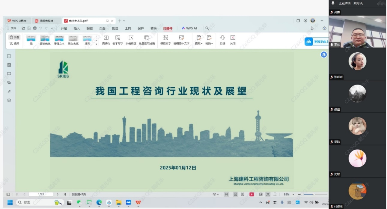 2025年1月12日下午21点游戏规则 2006级森林工程专业、2010级建筑与土木工程硕士专业校友、上海建科工程咨询有限公司高级工程师王东应邀为21点游戏规则 师生作了一场以“我国工程咨询行业现状及展望”为主题的讲座,土木21点游戏规则 本科生和研究生60余人参加了本次在线讲座活动,活动由21点游戏规则 副院长戴兆华主持。