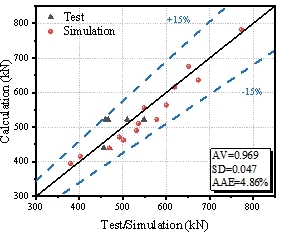 论文对6片跨度为16m的足尺预应力空心板进行抗剪试验,按照未加固、直接注浆加固和预损伤后注浆加固分组,研究损伤程度、加固方式对预应力空心板桥梁的加固效果。结果表明,预应力空心板经局部注浆填充剪跨区空腔加固,抗剪承载力提升8.7%~20.4%,顶部压应变与底部拉应变减小11%~45%,腹板主拉应变降低10%~45%。进一步,通过有限元仿真,模拟了预应力空心板加固前后的剪切受力过程,量化分析了剪跨比与注浆范围对抗剪承载力的影响。最后,根据试验和有限元模拟结果,对相关规范的抗剪承载力计算公式进行了修正,并提出了注浆加固预应力空心板的抗剪承载力计算模型。
