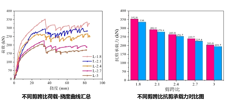 不同参数竹筋混凝土梁四点弯曲试验下荷载-跨中挠度曲线对比