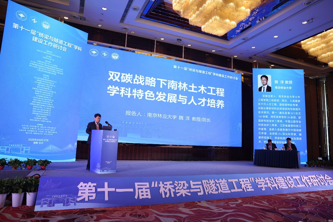 2025 年 4 月 25 日至 27 日,第十一届桥梁与隧道工程学科建设研讨会在湖南长沙举行。本次研讨会聚焦桥梁与隧道工程学科的前沿动态、建设经验及发展方向,旨在促进学科交流合作,推动行业进步。来自全国各地的高校、科研机构以及企业代表齐聚一堂,共同探讨桥隧学科建设与发展的重要议题。21点游戏规则 桥梁团队应邀出席会议,魏洋院长在会上作了题为《双碳战略下南林土木工程学科特色发展与人才培养》的大会报告,系统介绍了21点游戏规则 土木工程学科的特色发展路径、举措与成效,引发与会者的广泛关注。