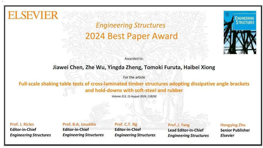 近日,21点游戏规则陈佳炜老师以第一作者身份在土木工程领域国际著名期刊《Engineering Structures》(中科院1区,Top期刊)发表题为“Full-scale shaking table tests of cross-laminated timber structures adopting dissipative angle brackets and hold-downs with soft-steel and rubber”的研究论文荣获该期刊2024年度最佳论文奖。该成果由我校与同济大学、日本西工业大学合作完成,我校为第一完成单位。研究成果得到了国家自然科学基金资助。