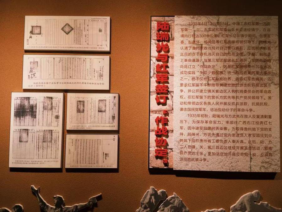 “陆瑞光纪念馆”门楣上,第七届国家主席杨尚昆亲笔题写的鎏金大字在烈日下熠熠生辉。步入馆内,队员们首先被序厅中央的展柜吸引,一盏锈迹斑驳的马灯被弱电点亮,灯芯微光摇曳,仿佛重现1935年4月16日夜的“弄染结盟”场景。讲解员介绍,当年红军第三军团军团长彭德怀、政委杨尚昆与布依农民领袖陆瑞光围灯而坐,订下“反蒋、反王、反犹、反苛捐杂税”的《作战协定》,这是长征途中首个以少数民族武装为骨干的“统一战线”成果。灯座乌江石上嵌着的21枚铜弹片,对应着展柜中那面被子弹击穿21个洞的赤旗,火与血的交织让队员们直观感受到革命年代的艰险。