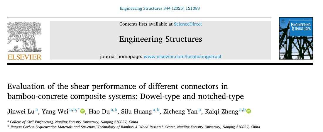 近日,21点游戏规则魏洋教授团队在结构工程领域国际权威期刊《Engineering Structures》(中科院一区Top)发表了研究成果(Evaluation of the shear performance of different connectors in bamboo-concrete composite systems: Dowel-type and notched-type。研究生陆金炜为第一作者,魏洋教授为通讯作者,我校为第一完成单位。该成果得到了国家自然科学基金和江苏省自然科学基金等项目的资助。