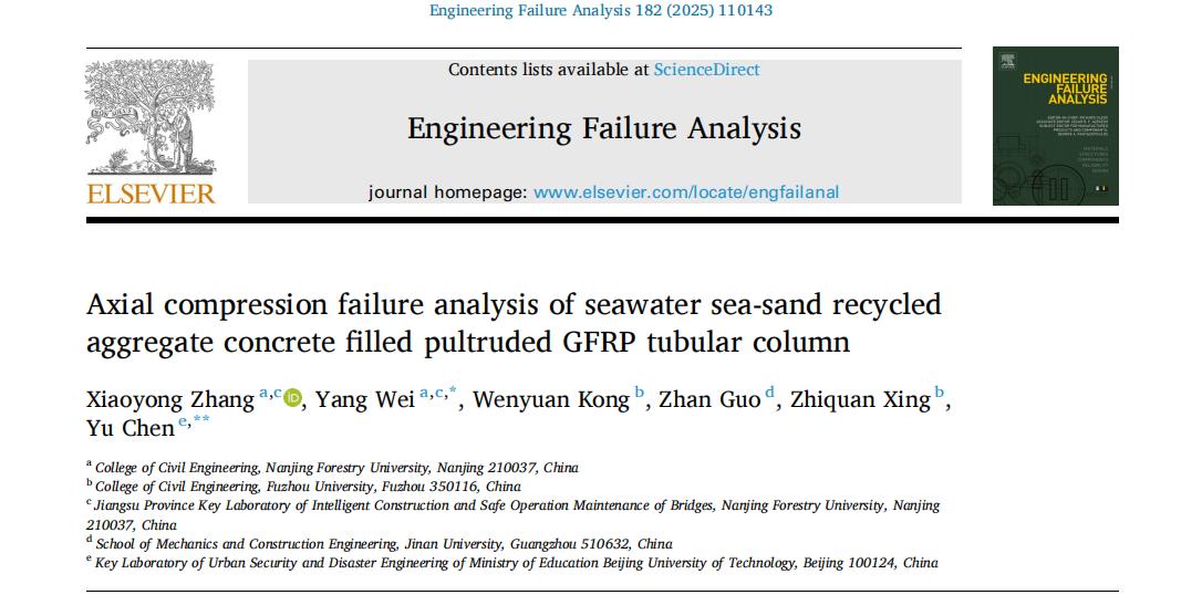 近日,21点游戏规则张晓勇老师在结构工程领域国际权威期刊《Engineering Failure Analysis》(中科院2区)发表了研究成果(Axial compression failure analysis of seawater sea-sand recycled aggregate concrete filled pultruded GFRP tubular column)。张晓勇老师为第一作者,魏洋教授和北京工业大学陈誉教授为通讯作者,我校为第一完成单位。该成果得到了国家自然科学基金和江苏省自然科学基金等项目的资助。
