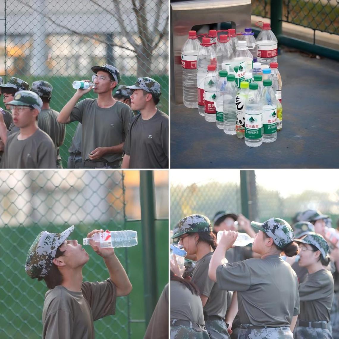 高温训练后的补水尤为重要。同学们轮流来到休息区,畅饮清凉的矿泉水。有些同学互相帮忙递水,体现着团队互助精神。