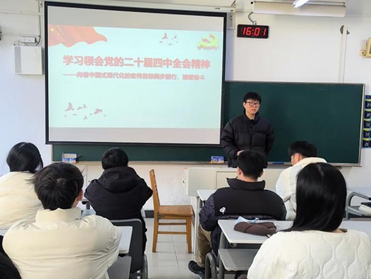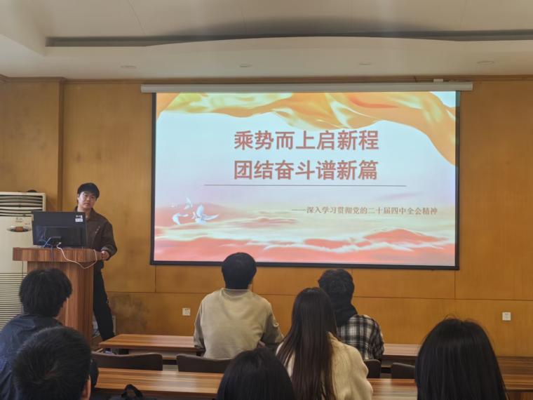 11月27日下午,学院在3324报告厅组织团学骨干召开学习贯彻党的二十届四中全会精神专题研讨会。20余名团学骨干紧密结合思想实际与工作职责,分享学习体会。学院学生会主席邱正好提到:“党的二十届四中全会提出‘坚持以人民为中心的发展思想’,我们要将其融入学生服务工作,比如优化‘一站式’权益反馈机制,解决同学急难愁盼问题。”22106022班团支书、学校第28届研究生支教团成员徐瑶表示:“作为青年志愿者,要以党的二十届四中全会精神为指引,拓展‘乡村振兴’‘社区服务’等志愿项目,让青春在奉献中闪光。”研讨会上,大家围绕“如何理解‘乘势而上’的历史方位”“怎样践行‘团结奋斗’的时代要求”等核心议题展开深度交流,形成“以骨干带全员、以行动促落实”的共识。