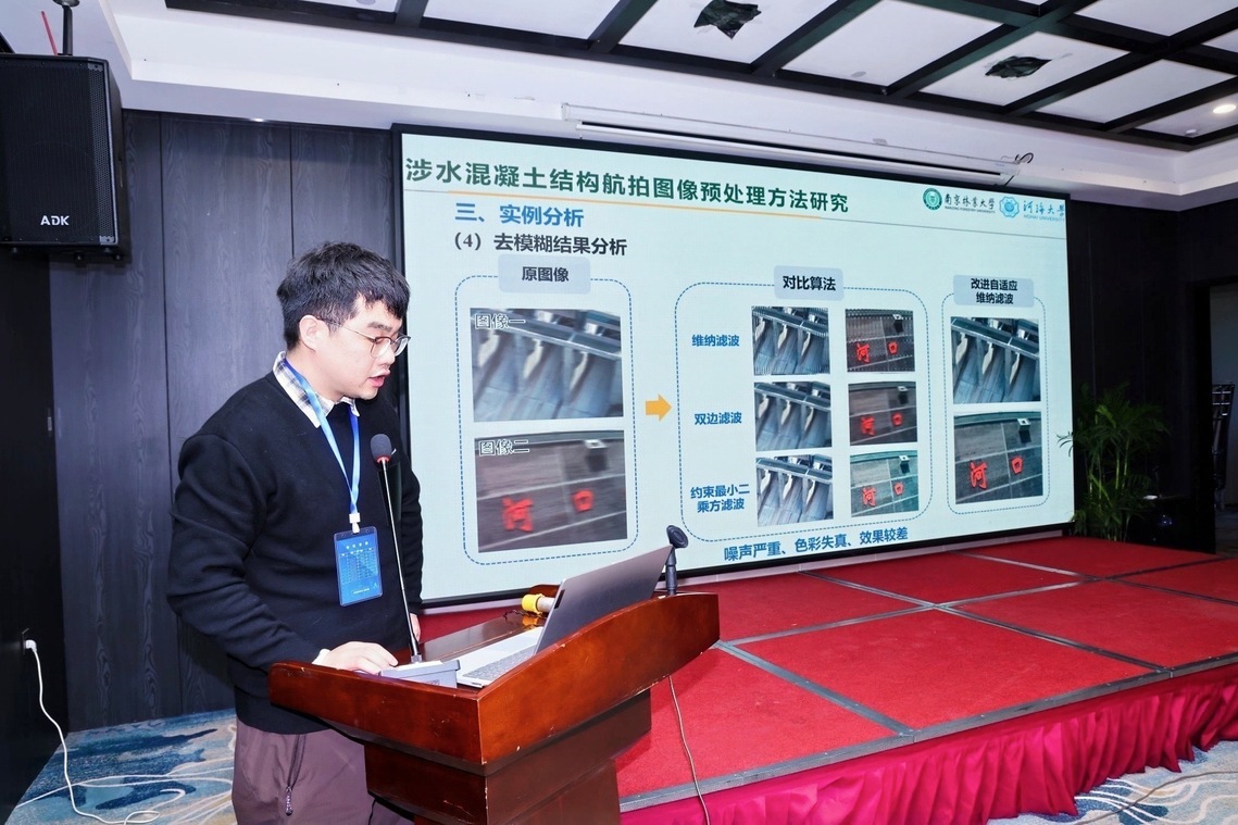 李扬涛老师应邀作题为《基于计算机视觉的涉水混凝土结构缺陷三维重建与定量判识关键技术研究》报告。围绕重大涉水混凝土结构在长期环境侵蚀与反复水力-荷载作用下的病害监测难题,报告系统梳理了传统人工巡检在效率、客观性与可靠性方面的突出不足。借助人工智能与计算机视觉技术,针对大体量涉水混凝土结构,开展了航拍影像增强、裂缝智能识别、精细化语义分割及多视角三维重建等关键技术研究,构建了集缺陷检测、空间定位与定量表征于一体的智能巡检流程。展望未来,将进一步发展多类别病害识别、动态演化跟踪与数字孪生驱动的安全监测体系,为重大涉水混凝土结构的本质安全与智慧运维提供坚实的技术支撑。相关成果在会议上获得与会专家的高度关注。