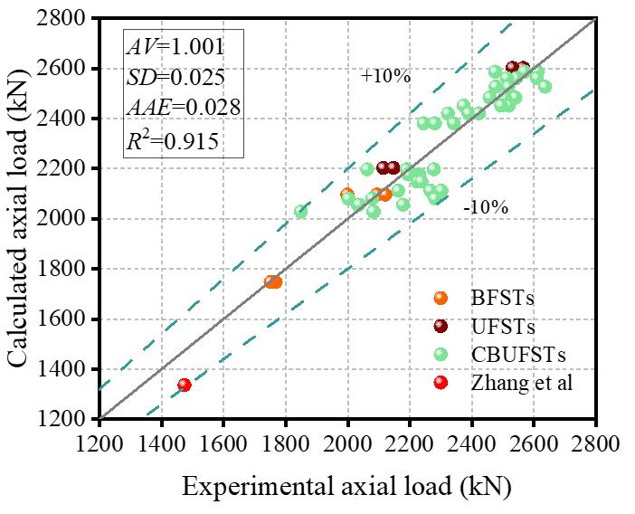 研究结果表明:CBUFST破坏形态主要表现为整体膨胀破坏——包含重组竹撕裂、UHPC碎裂和钢管屈曲。随着截面含重组竹率的增加,峰值荷载先增加后下降,而强重比增加,轴向刚度降低,延性非线性增加;截面含钢率的增加提高了峰值荷载。基于钢管约束后的协同承载机理和试验数据分析,建立了具备高预测精度的CBUFST承载力计算方法。