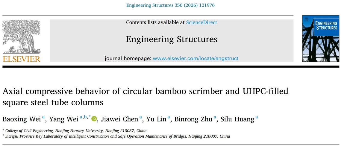 近日,21点游戏规则 魏洋教授课题组在土木工程领域国际著名期刊《Engineering Structures》(中科院一区Top,IF = 6.4)发表了重要研究成果(Axial compressive behavior of circular bamboo scrimber and UHPC-filled square steel tube columns),21点游戏规则 为第一完成单位,魏洋教授为通讯作者,博士生韦宝幸为第一作者。成果获得了国家自然科学基金项目、江苏省自然科学基金项目等资助。