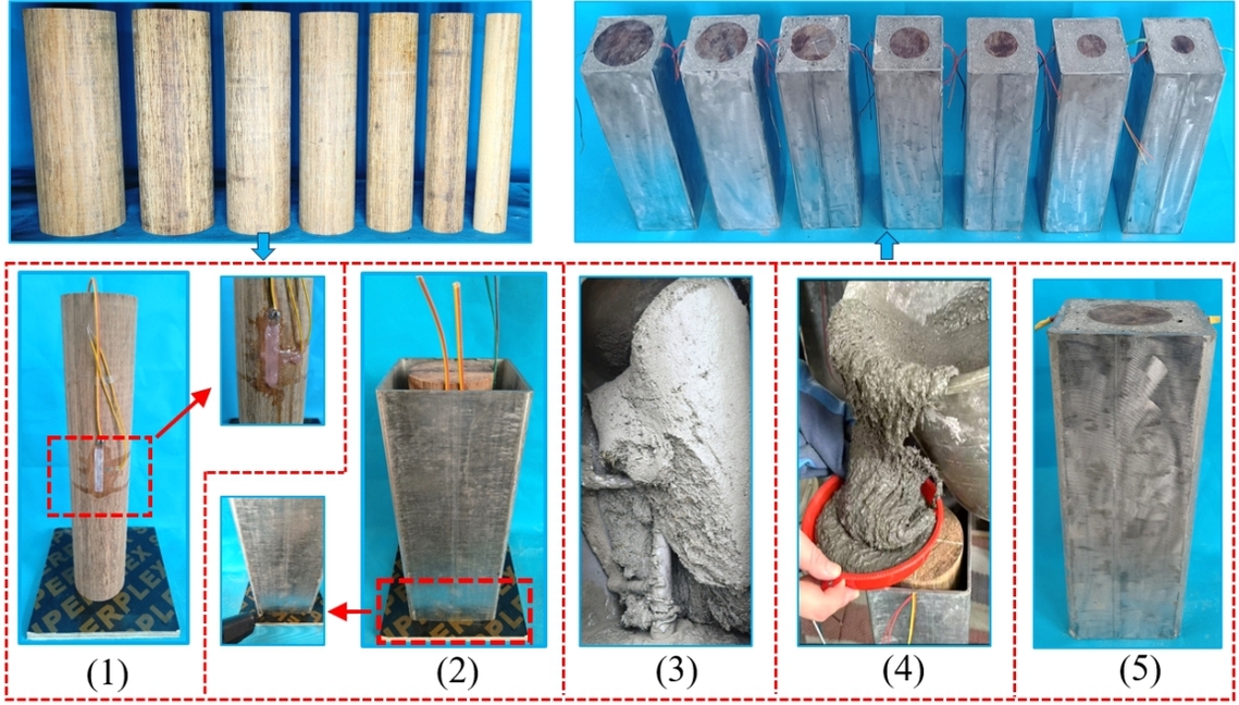 魏洋课题组已开展了系列内置重组竹的钢管UHPC组合柱结构性能及受力机理研究,本研究设计了42个内置圆形重组竹的方形钢管UHPC组合柱、6个方形钢管重组竹柱(BFST)对比试件、6个方形钢管UHPC柱(UFST)对比试件,开展了全截面单调轴压性能测试。重点考察截面含重组竹率、截面含钢率等主要参数对CBUFST的破坏形式、初始刚度、荷载-应变曲线形态、峰后延性等关键受压性能指标的影响,并揭示重组竹、UHPC和钢管的协同受压机制。