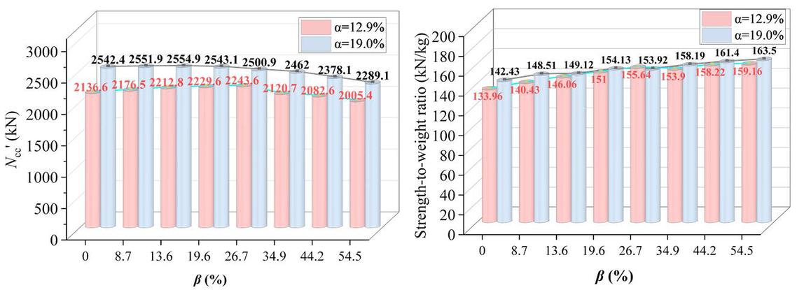 截面含重组竹率对平均峰值荷载和强重比的影响