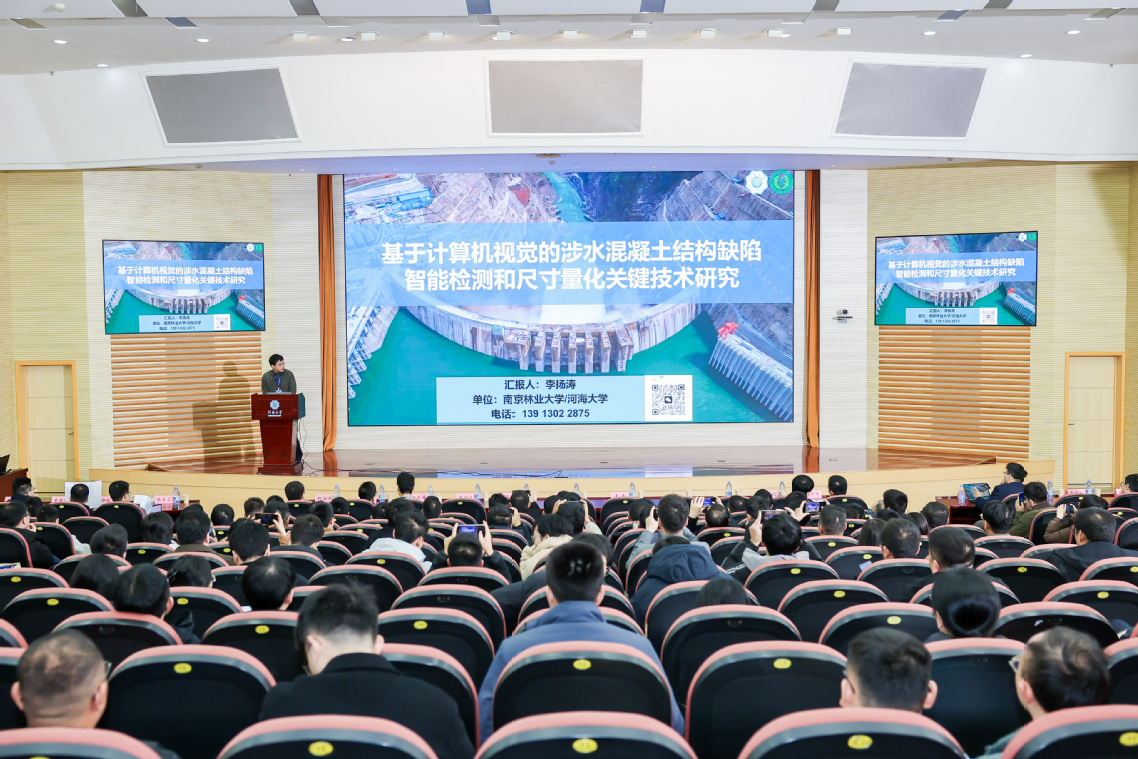 在大会上,李扬涛老师作了题为《基于计算机视觉的涉水混凝土结构缺陷智能检测和尺寸量化关键技术研究》的学术报告。报告聚焦水下混凝土结构在长期水环境侵蚀及复杂水力与荷载耦合作用下的缺陷识别与运维难题,系统分析了传统人工与经验型检测方式在效率、一致性和安全性方面存在的局限。依托人工智能与计算机视觉方法,围绕大尺度水下混凝土结构,开展了水下影像质量增强、裂缝与表观病害智能识别、精细化语义分割以及多视角三维重建与尺寸量化等关键技术研究,构建了面向工程应用的智能检测与评估流程。进一步结合结构运行需求,相关研究为实现水下混凝土结构缺陷的精准识别、状态评估与智能化运维提供了技术支撑,研究成果在会议交流中受到与会专家的广泛关注。