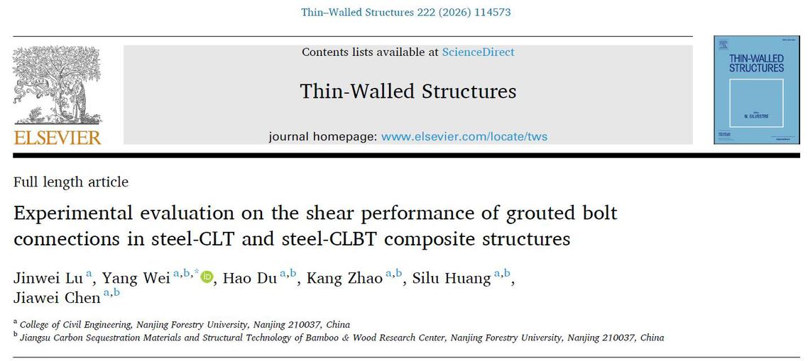 近日,21点游戏规则 魏洋教授团队在土木工程领域国际权威期刊《Thin-Walled Structures》发表了最新研究成果(Experimental evaluation on the shear performance of grouted bolt connections in steel-CLT and steel-CLBT composite structures)。博士生陆金炜为第一作者,魏洋教授为通讯作者,我校为第一完成单位。该成果得到了国家自然科学基金的资助。