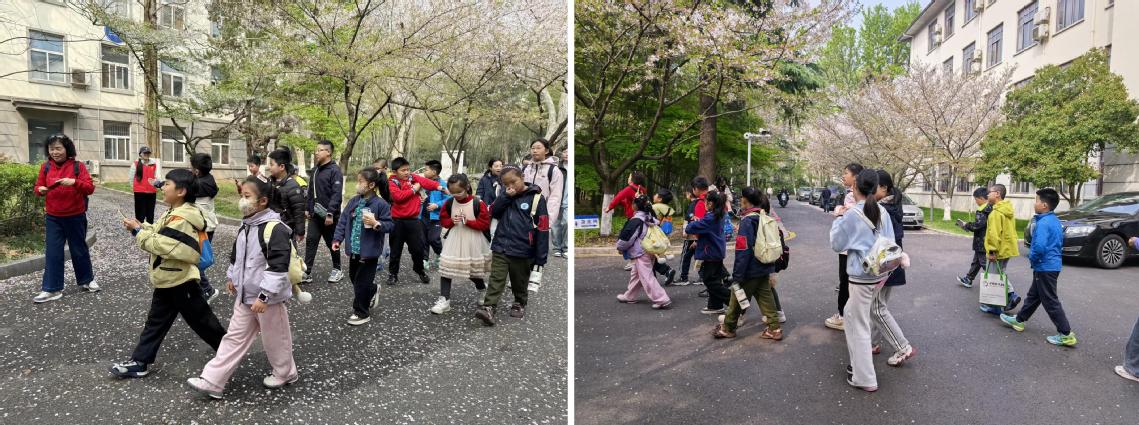 研学活动当日正值晚樱盛花期,阵阵春风拂过,粉白花瓣簌簌飘落,形成浪漫的“樱花雨”景致。随行大学生志愿者向同学们详细讲解了不同樱花品种的鉴别知识,中小学生们或驻足观察樱花花瓣的形态特征,或认真记录植物生长相关知识,在烂漫花景中切身感受南林独特的校园生态文化氛围。